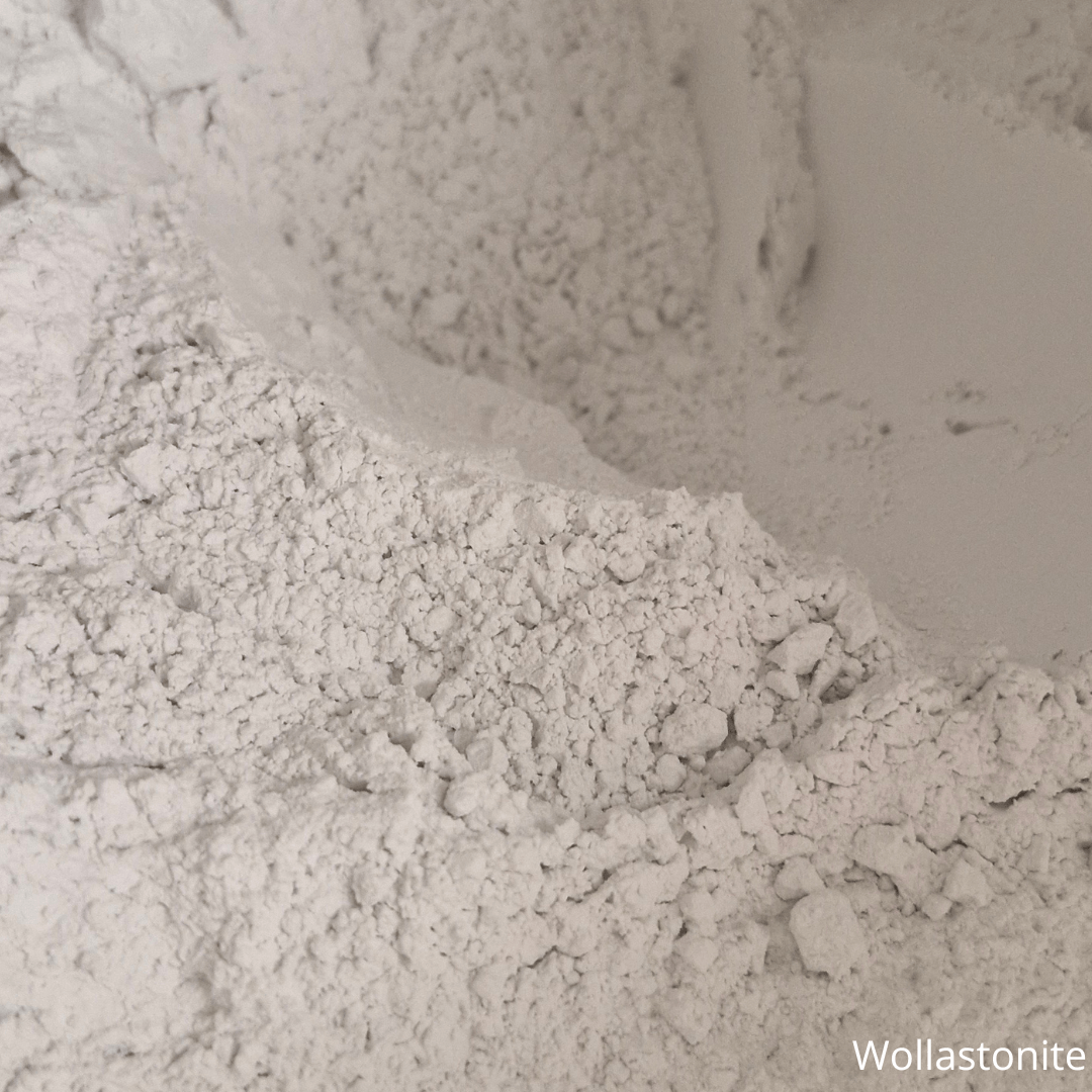 Wollastonite : La wollastonite est un minéral utilisé en céramique comme fondant. Elle améliore la résistance mécanique, réduit la déformation lors de la cuisson et renforce la stabilité thermique des pièces céramiques.